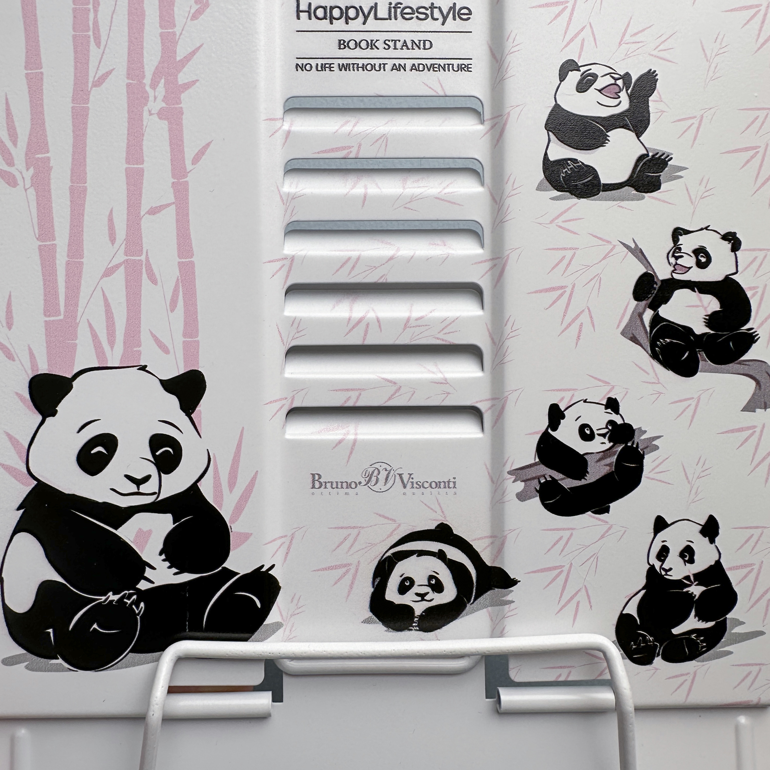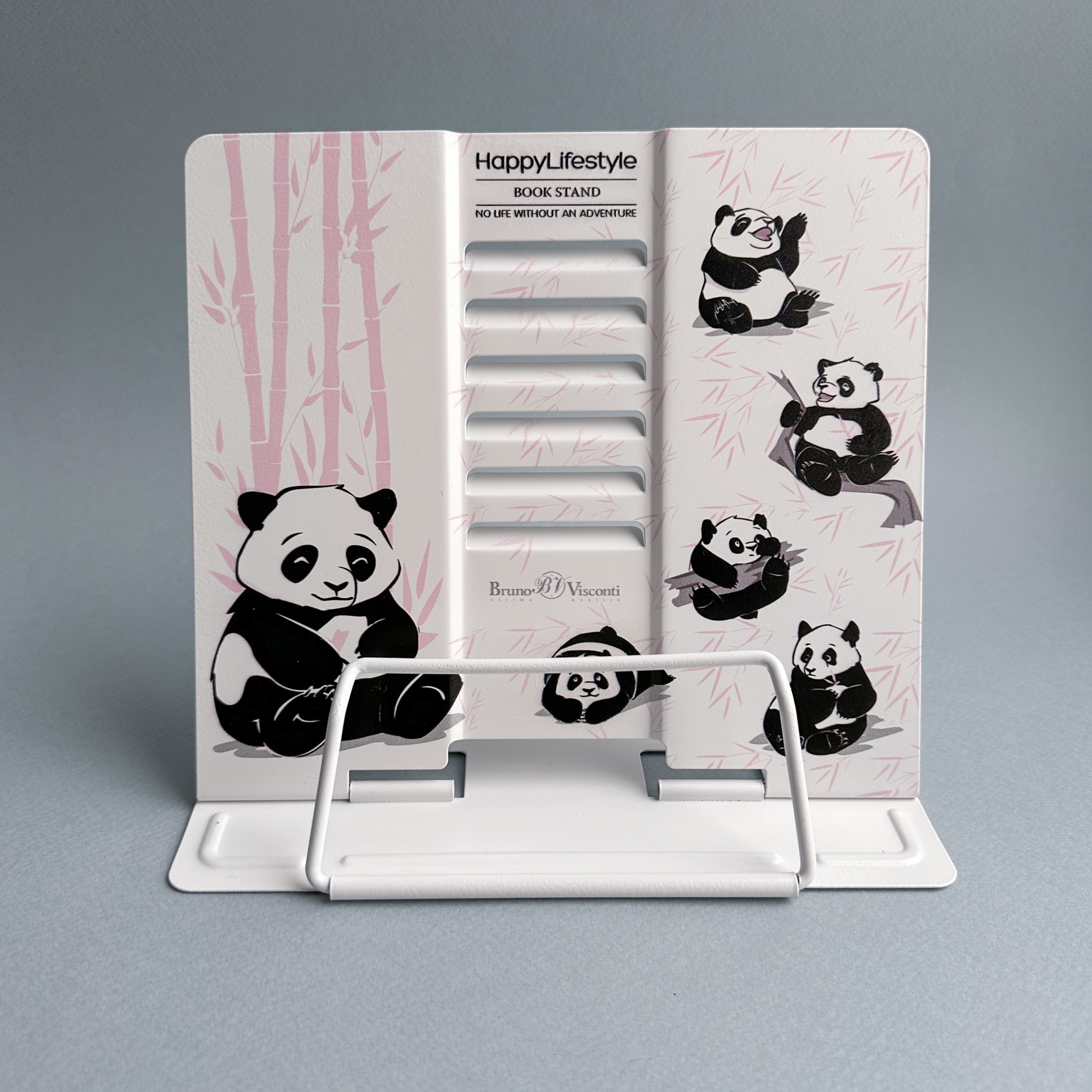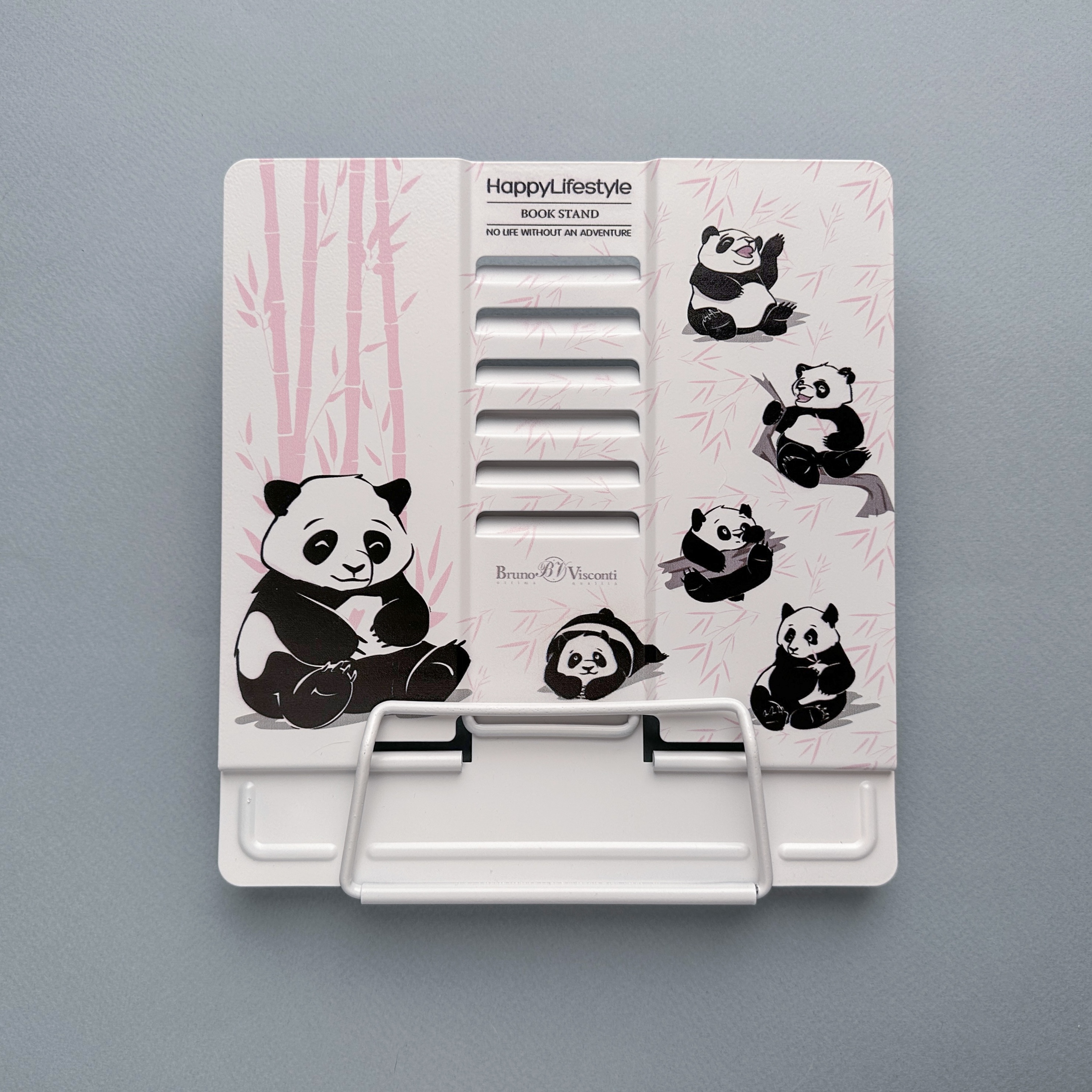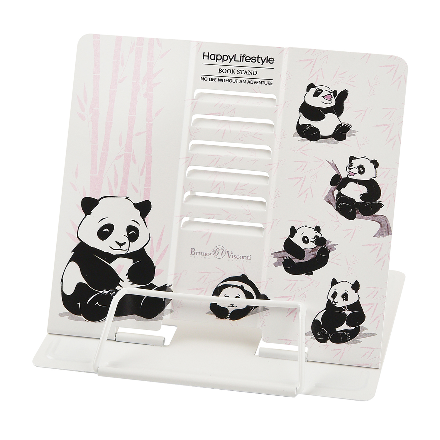 Металлическая подставка "Панды" с регулировкой наклона и прижимным механизмом для страниц от Bruno Visconti. Несколько ступеней спинки позволяют использовать ее в соответствии с индивидуальными предпочтениями и привычками и читать книгу под разным уровнем наклона. Подставка легкая, прочная и компактная - не займет много места в школьном рюкзаке. В ее основании есть резиновые стопоры, которые уберегут подставку от скольжения, а стол - от царапин. Яркий и позитивный дизайн не оставит никого равнодушным.